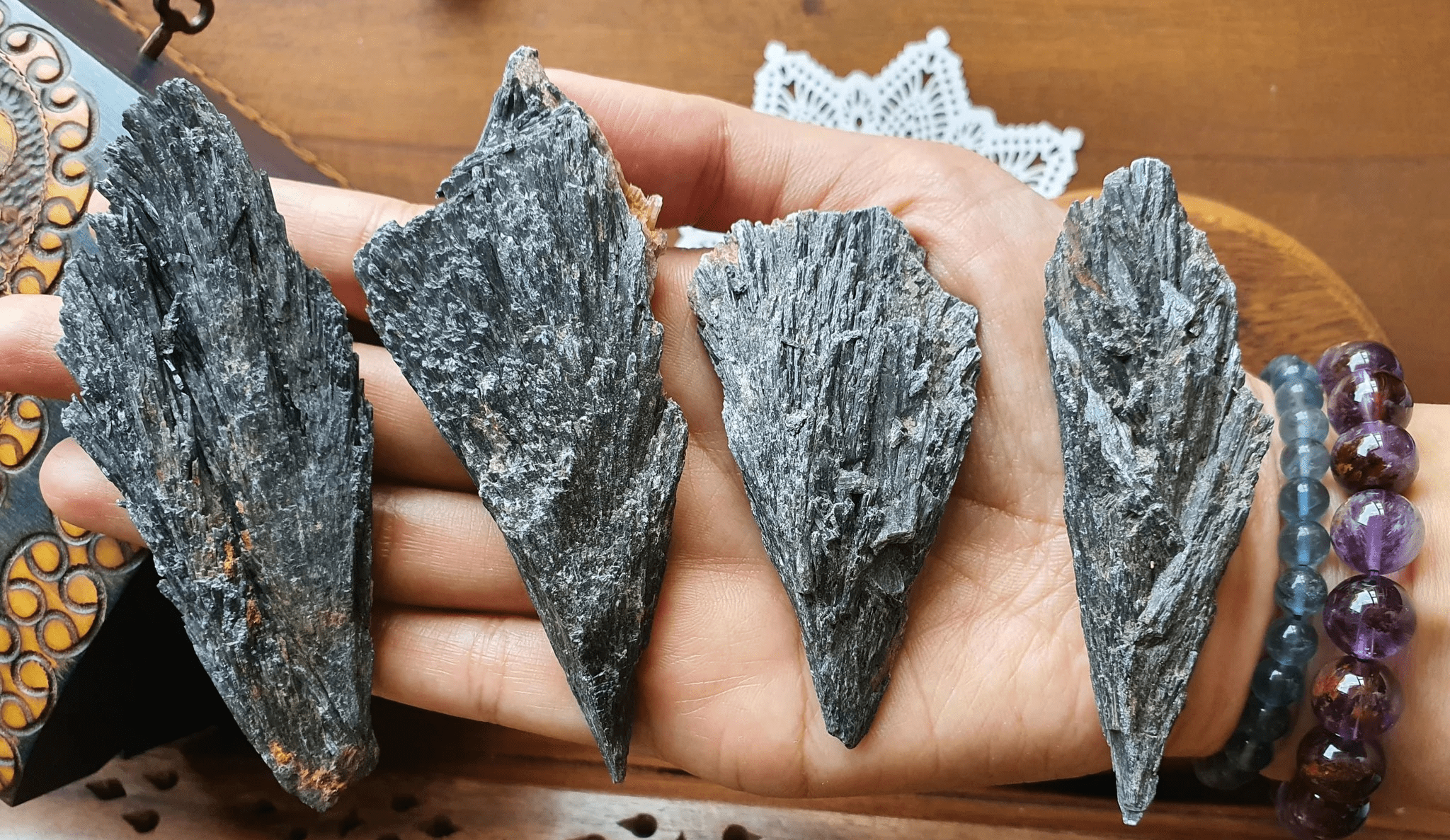 Black Kyanite is a high vibrational stone that has an unusual, rugged fan-like shape with a rough exterior. This crystal helps to protect against negative energy in all forms including spiritual energies like hauntings or even entities. Place it in the house or office to ward off evil spirits and remove dark, heavy energies. If you are going through an overwhelming and challenging period in your life carry a piece of this stone to help center you and bring you back to alignment. It’s an excellent energy purifier and helps to mend auric tears. Fan this across your auric field to remove unwanted energies that has attached itself onto you. It cuts and clears away energies that is not your own. If you have a string of bad luck lately, sweep this across your body to help clear out negative vibrations that may be holding you back. It’s also a tool used to cut energy cords and set boundaries. As you sweep this across your body, visualize the black Kyanite cutting cords to people, objects, relationships, even traumatic events or experiences in your life that you cannot move on from. It helps free us from the weight of the past and move forward in our lives. Black Kyanite is also an excellent crystal to remove blocked energies in chakras, meridians or just place it on top of any part of your body that needs healing.